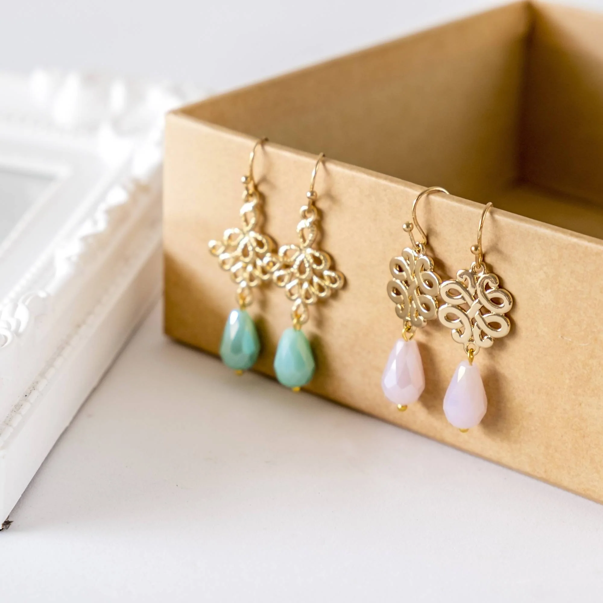 - Earring Materials: Gold link, glass beads